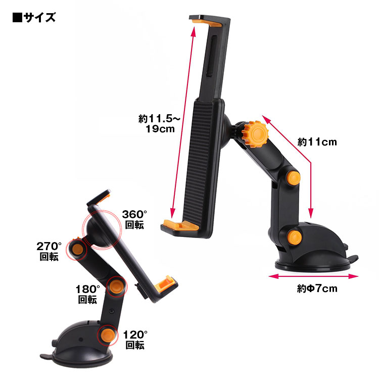 最長約11cmになる3軸で角度を調節できるアームを装備。スマートフォン・タブレットをダッシュボードに取付け、ムービー鑑賞や地図アプリでナビ代わりに使用できます。