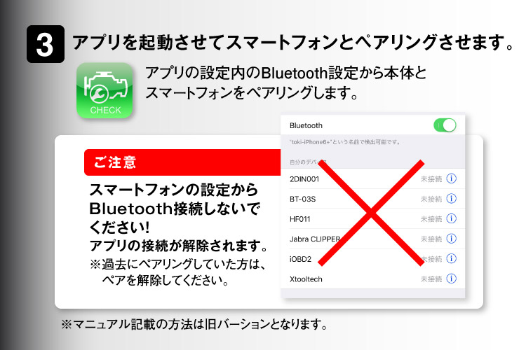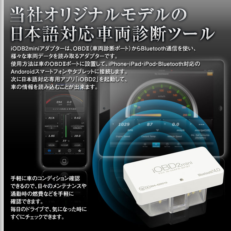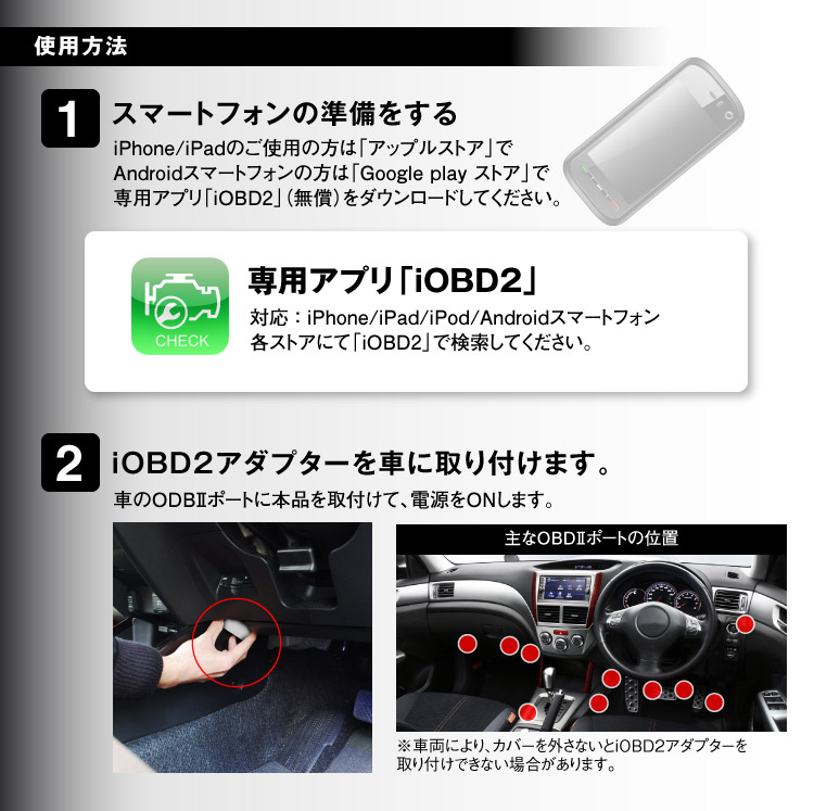 使用方法は車のOBD2(車両診断ポート)に設置し、iPhone・iPad・スマートフォンとBluetooth接続します。日本語対応専用アプリ「iOBD2」を使用することにより、お車の情報を読み込み出来ます。