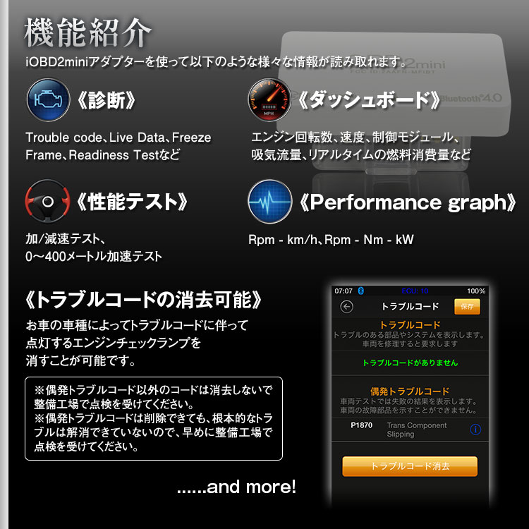 - 診断機能(OBD-II準拠):Trouble code、Live Data、Freeze Frame、Readiness Testなど