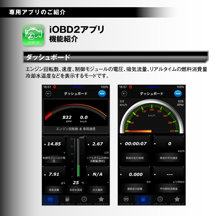 - 表示機能:速度、エンジン回転数、制御モジュールの電圧、吸気流量、リアルタイムの燃料消費量(動・静的)、冷却水温度、連続走行距離、平均燃料消費量、加速度、その他