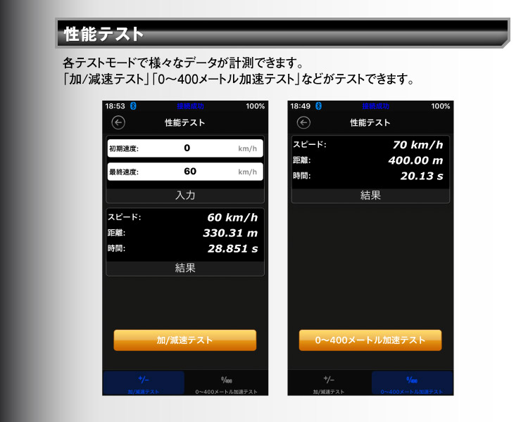 加/減速テストや0?400メートルの加速テストが可能です。