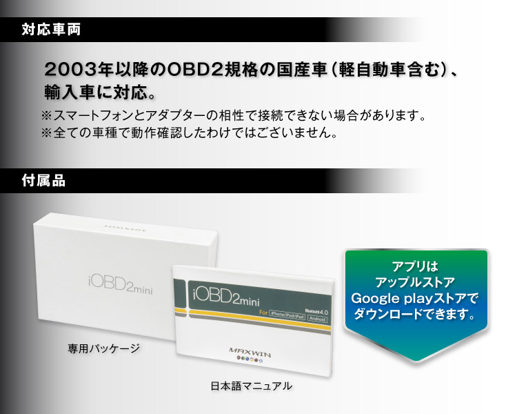 - 対応車種:2003年以降のOBD2規格の国産車(軽自動車含む)、輸入車全ての車種に対応