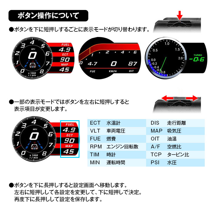 本体ボタン操作で表示モードや表示項目を自由に切り替えることができます。スタイリッシュなデザインでデータが一目瞭然。運転がもっと楽しくなります。