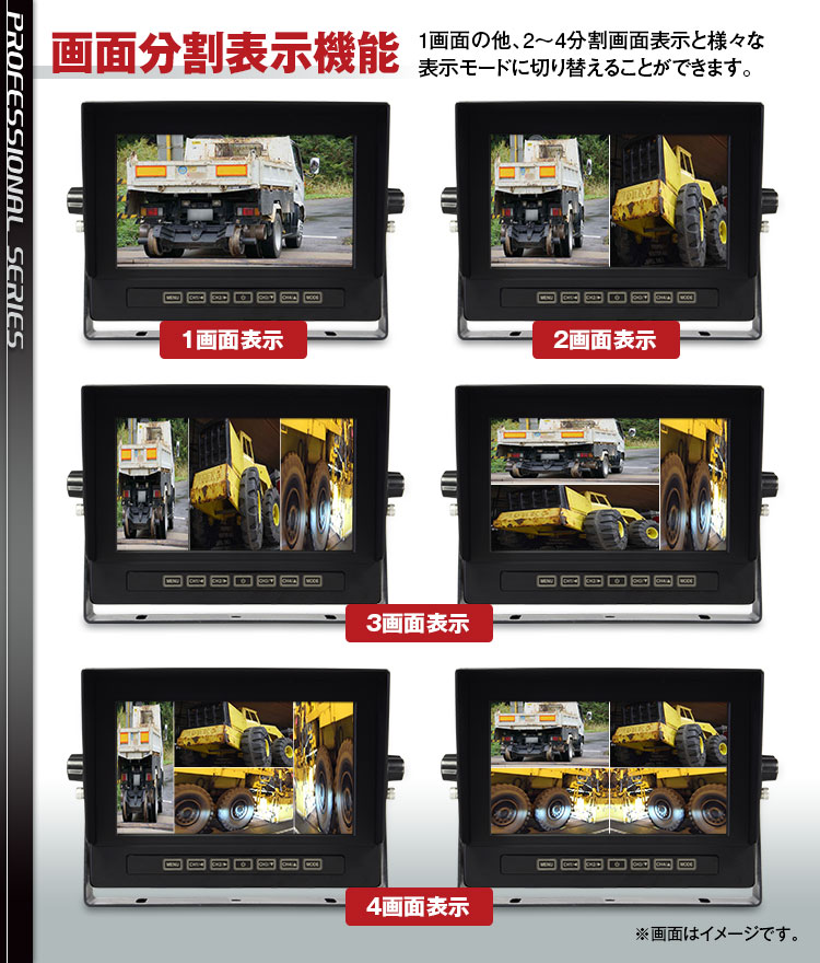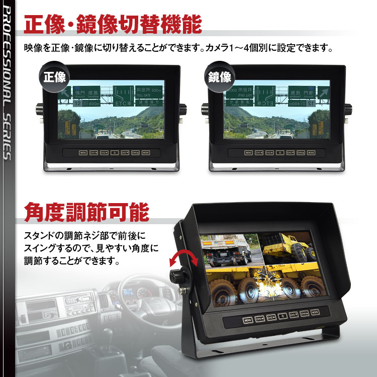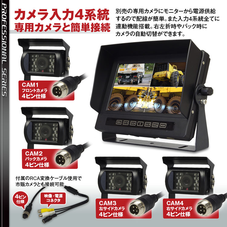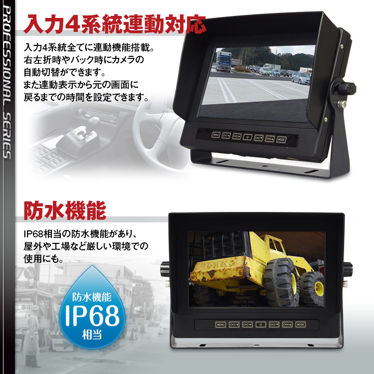 車載カメラ確認用に特化した液晶モニターです。入力4系統全てに連動対応。
