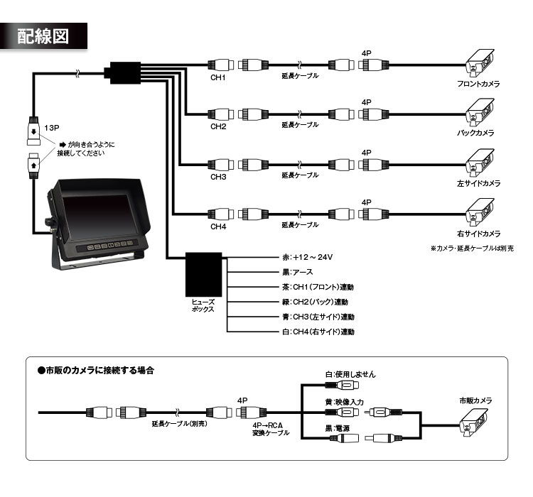 付属のRCA変換ケーブルを使用することで市販カメラの接続も可能です。