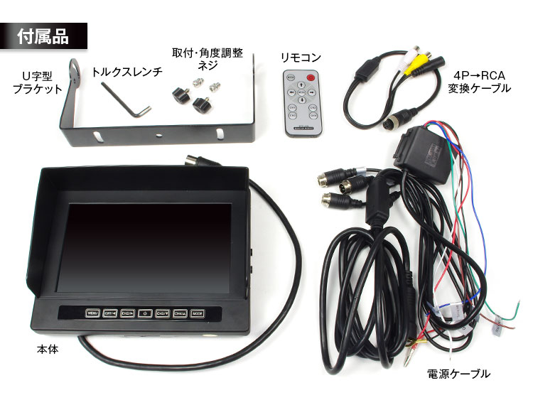 《付属品》本体×1、リモコン×1、ブラケット×1、電源ケーブル×1、4P→RCA変換ケーブル×1、トルクスレンチ×1、取付・角度調整ネジ、取付・取扱説明書