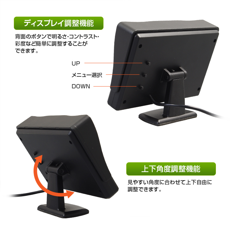 RCA端子(映像のみ)採用ですのでカーナビやDVDプレーヤー、バックカメラの接続が簡単に行えます。