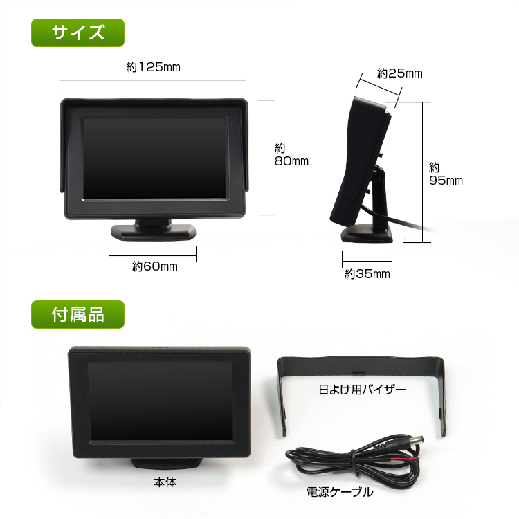4.3インチの小型モニターなので、バックカメラ等のサブモニターとして非常に便利なアイテムです。取付も簡単なので、バックカメラとセットでどうぞ!