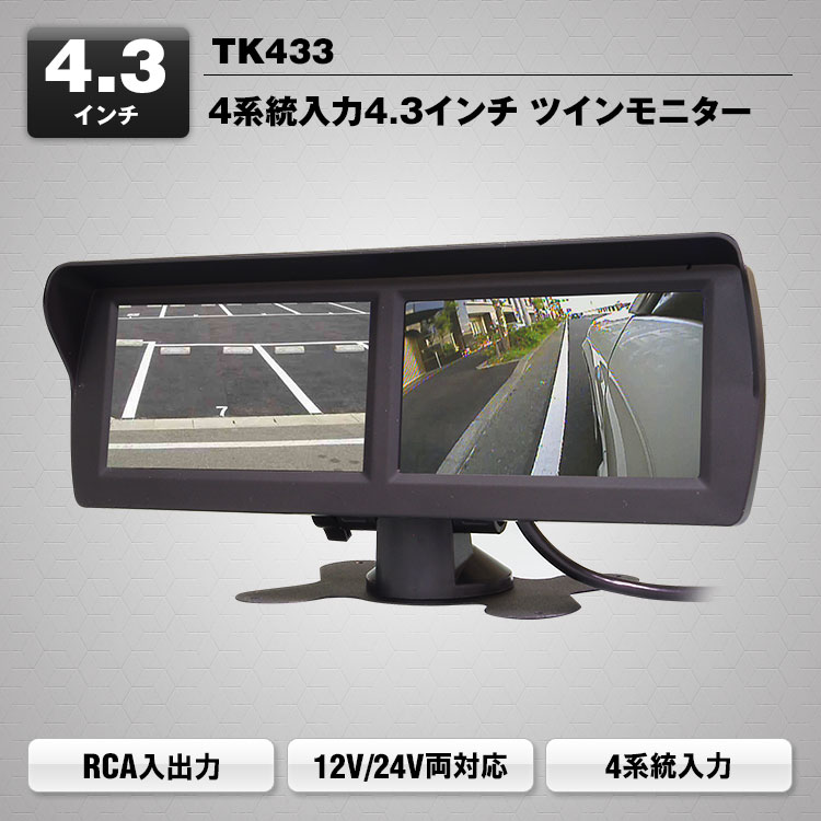 4.3インチツインモニター搭載で同時に2画面のチェックが可能。それぞれのモニターに2系統の映像入力があるので、例えば前方・両サイド・後方の4つのカメラを接続しておけば、それぞれの画面を2つのカメラでチェックできます。