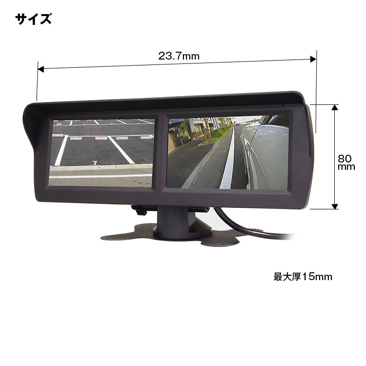 4.3インチの2画面モニターにそれぞれのカメラ映像を同時に表示することができます。