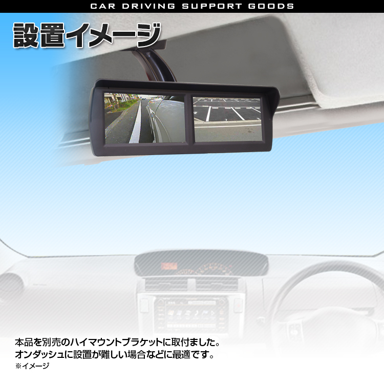別売のハイマウントモニターブラケットを使用し、室内ミラーの部分にも取り付け可能です。ダッシュボードもスッキリ!