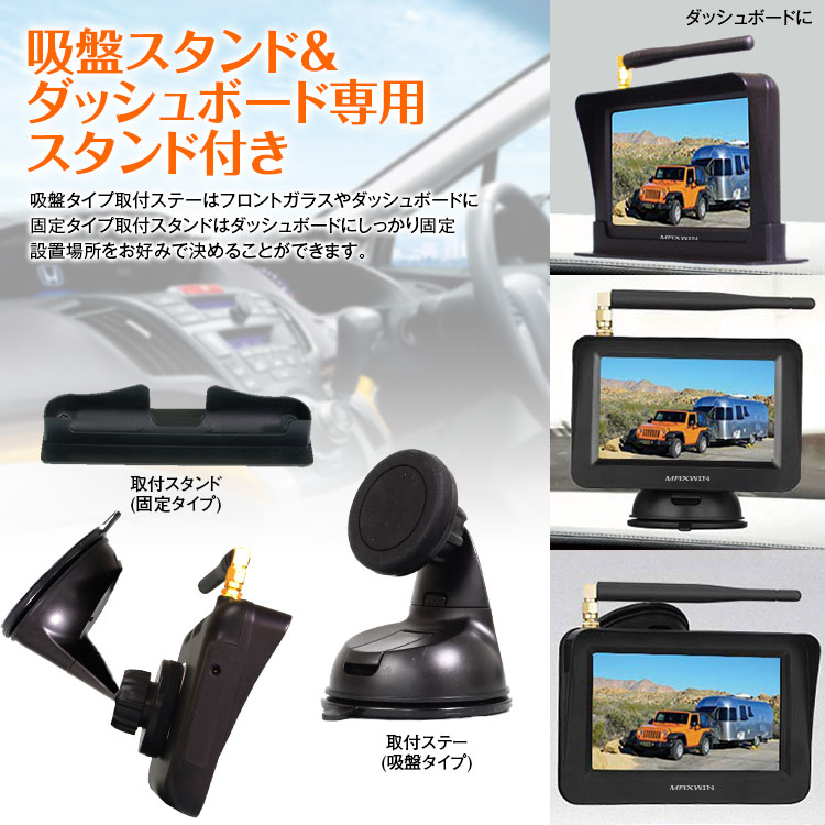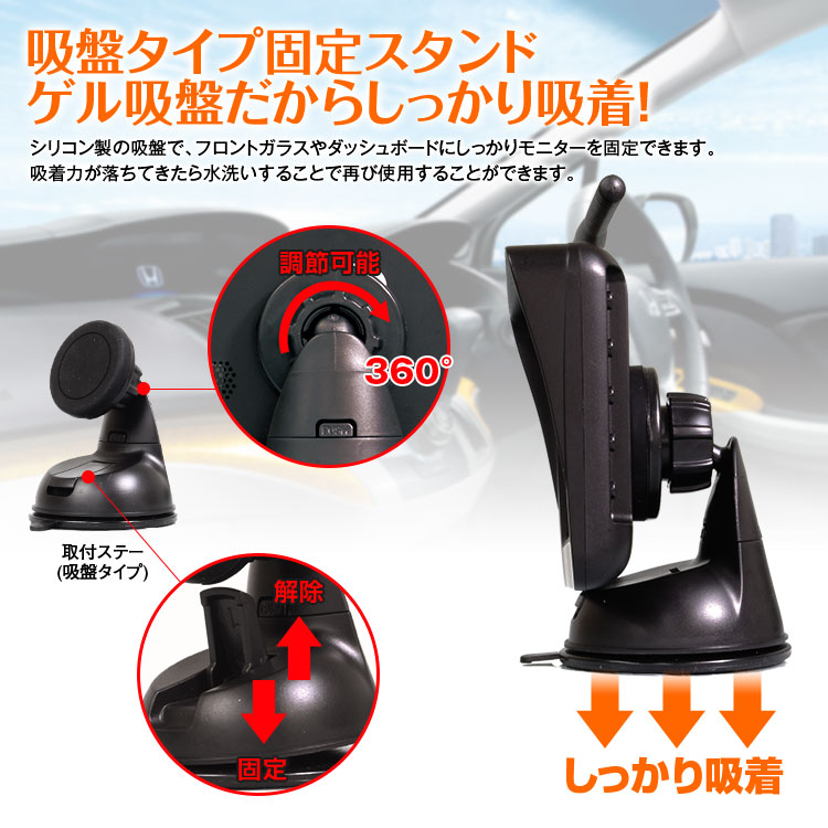 シリコン製の吸盤で、フロントガラスやダッシュボードにしっかりモニターを固定できます。吸着力が落ちてきたら水洗いすることで再び使用することができます。ダッシュボード専用スタンドも付属しているので設置場所をお好みで決めることができます。