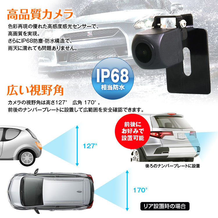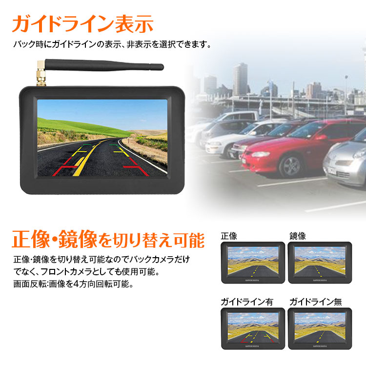 正像・鏡像を切り替え可能なのでバックカメラだけでなく、フロントカメラとしても使用可能。画面反転:画像を4方向回転可能。バック時にガイドラインの表示、非表示を選択できます。