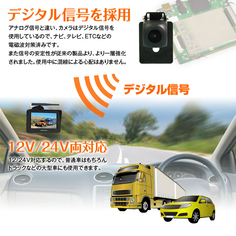 アナログ信号と違い、バックカメラはデジタル信号を使用しているので、ナビ、テレビ、ETCなどの電磁波対策済みです。また信号の安定性が従来の製品より、より一層強化されました。使用中に混線による心配はありません。