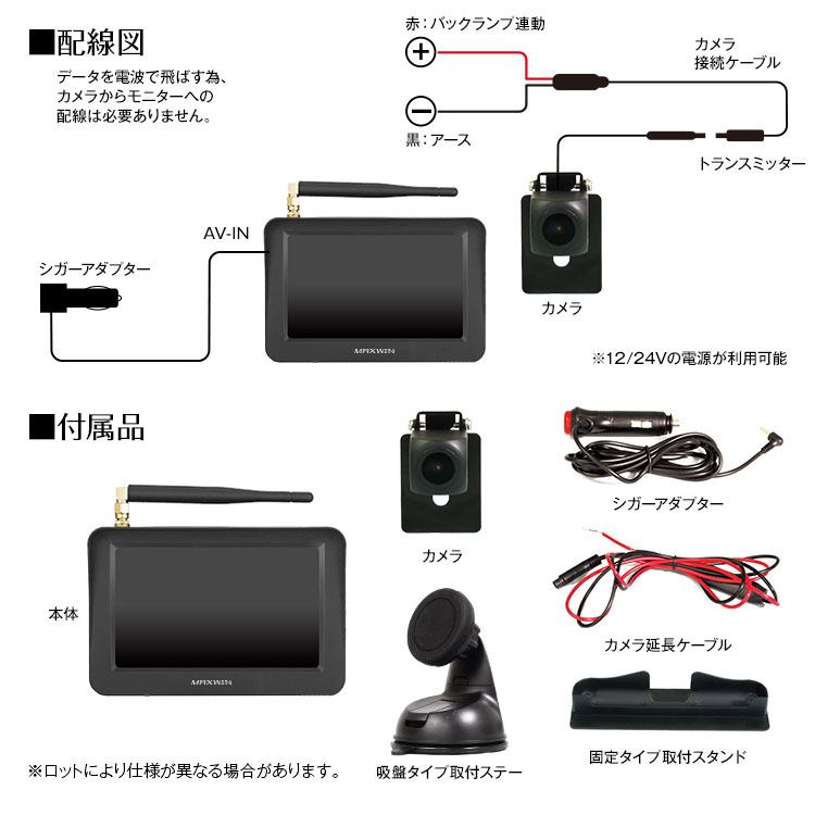 本体×1、シガーアダプタークカメラ×1、バックカメラ延長ケーブル×1、吸盤タイプ取付ステー×1、固定タイプ取付スタンド×1、配線コネクター×1セット、説明書×1