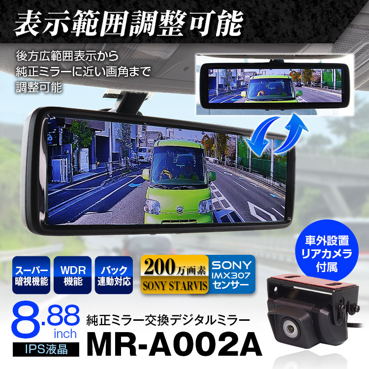 8.88インチ高解像度(1920×480)液晶モニター。フル画面表示可能。輝度は手動で3段階調整可能。視界を遮るものがなく大画面映像による後方の安全確認を可能にしました。