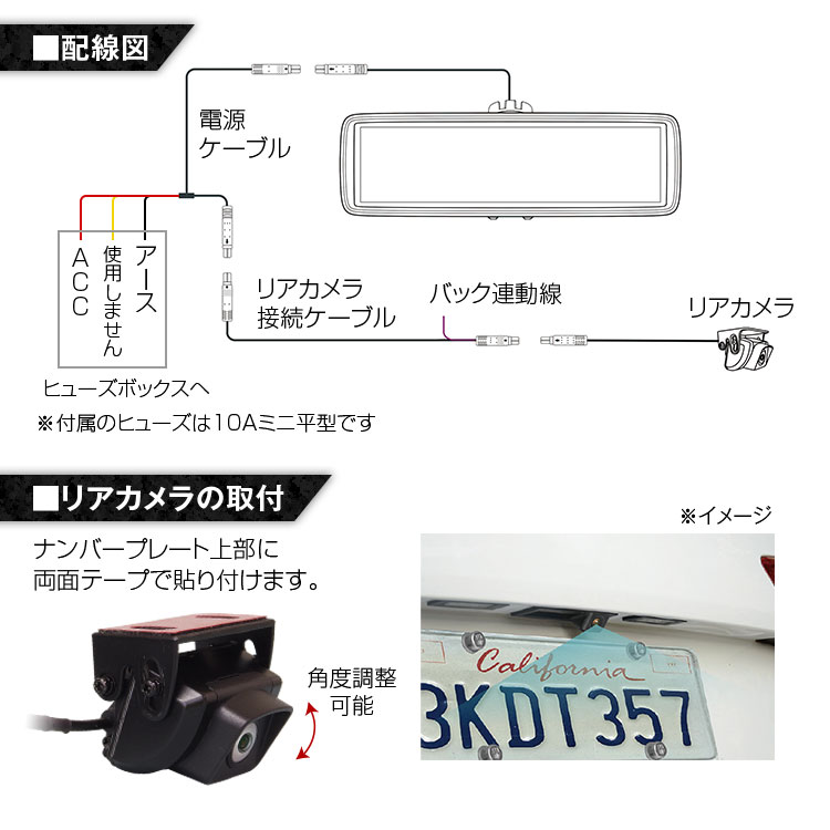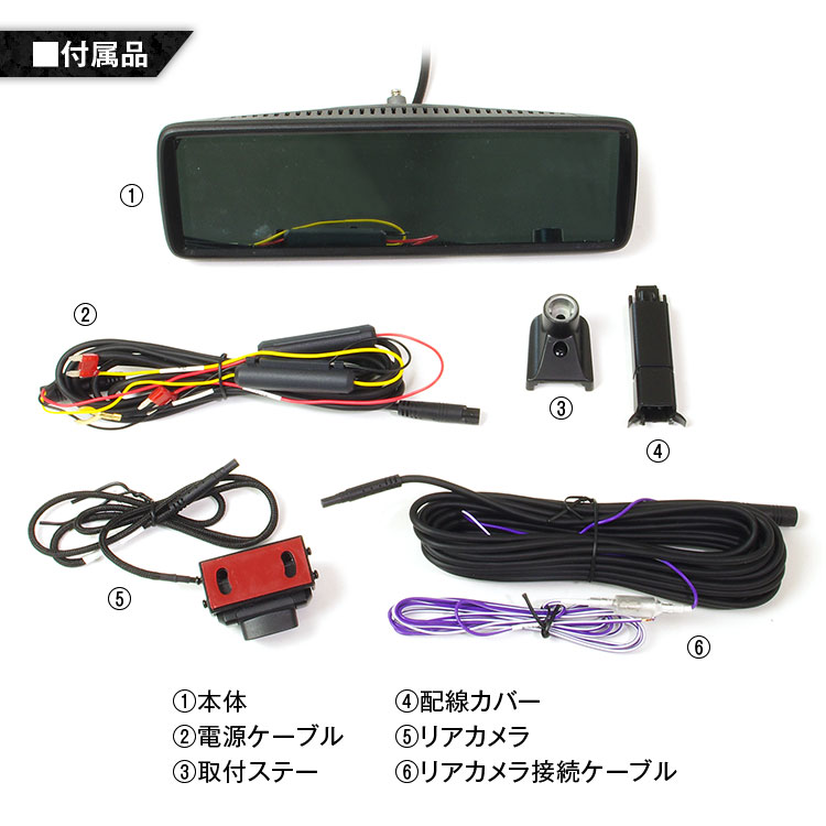 本体×1、電源ケーブル×1、リアカメラ×1、リアカメラ中継延長ケーブル×1、取扱説明書×1、台座×1、配線カバー×1