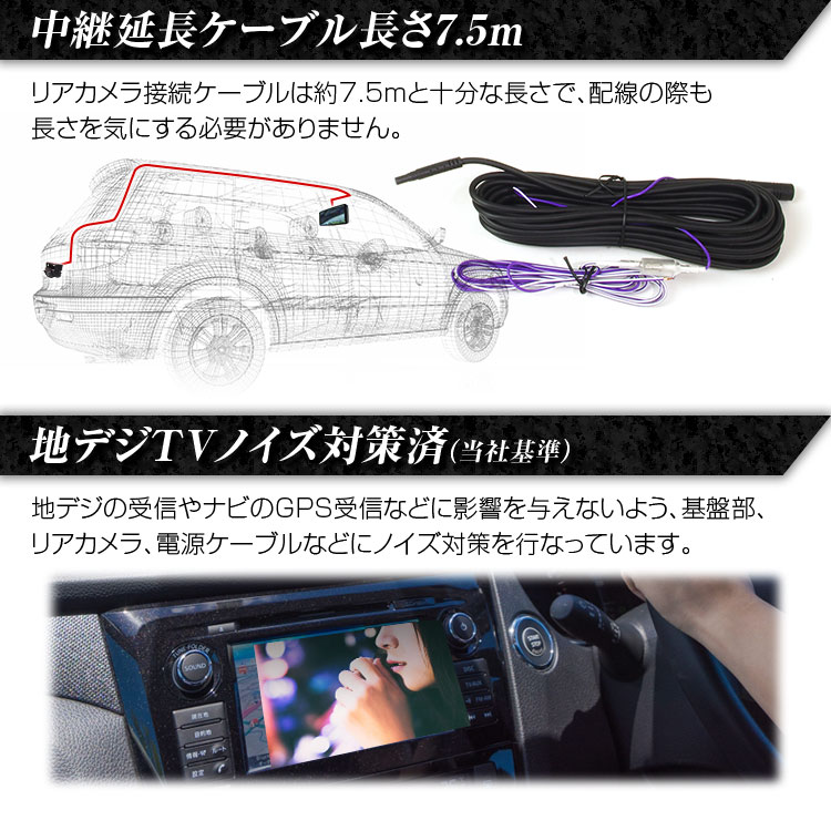 地デジの受信やナビのGPS受信などに影響を与えないよう、内蔵基盤や前後カメラ、電源ケーブルなどに当社基準のノイズ対策を施しています。