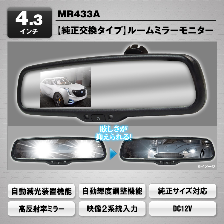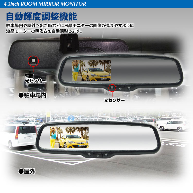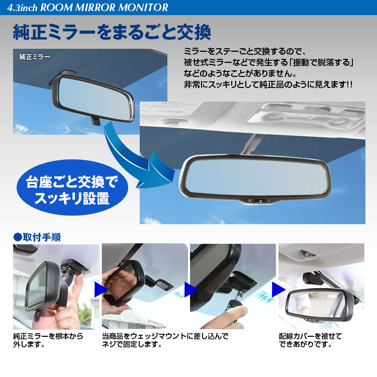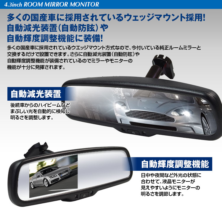 多くの国産車に採用されているウェッジマウント方式なので、今付いている純正ルームミラーと交換するだけで設置できます。さらに自動減光装置(自動防眩)や自動輝度調整機能が装備されているのでミラーやモニターの機能が十分に発揮されます。