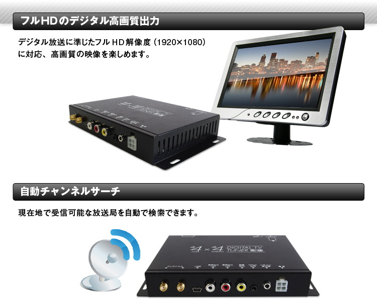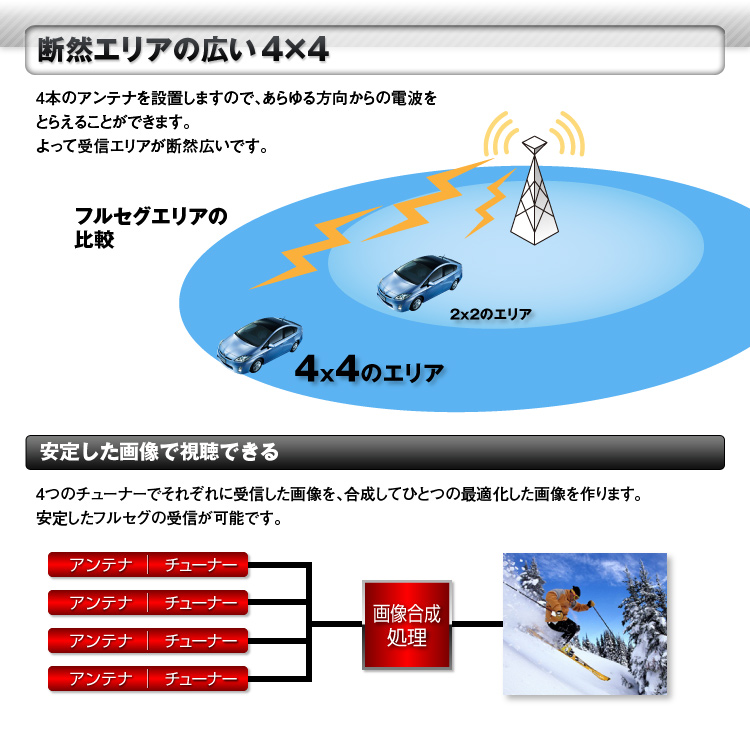 車載チューナーの中、最高クラスの4チューナー搭載。ダイバーシティ方式で受信環境のよいアンテナを自動検出しますので、より安定した画像を楽しめます。