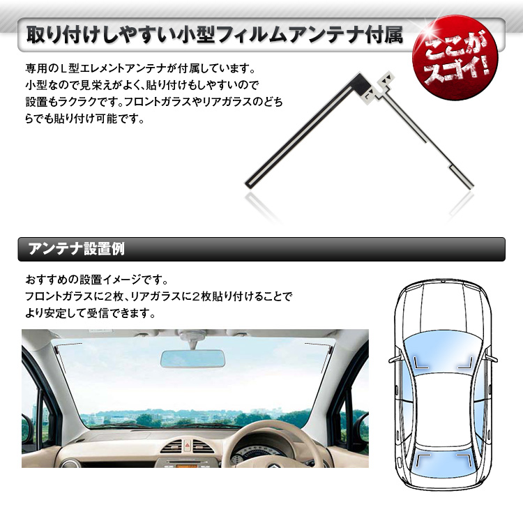 専用のL型エレメントアンテナ(ケーブル長さ:約5m)が付属しています。小型なので見栄えがよく、貼り付けもしやすいので設置もラクラクです。フロントガラスやリアガラスのどちらでも貼り付け可能です。